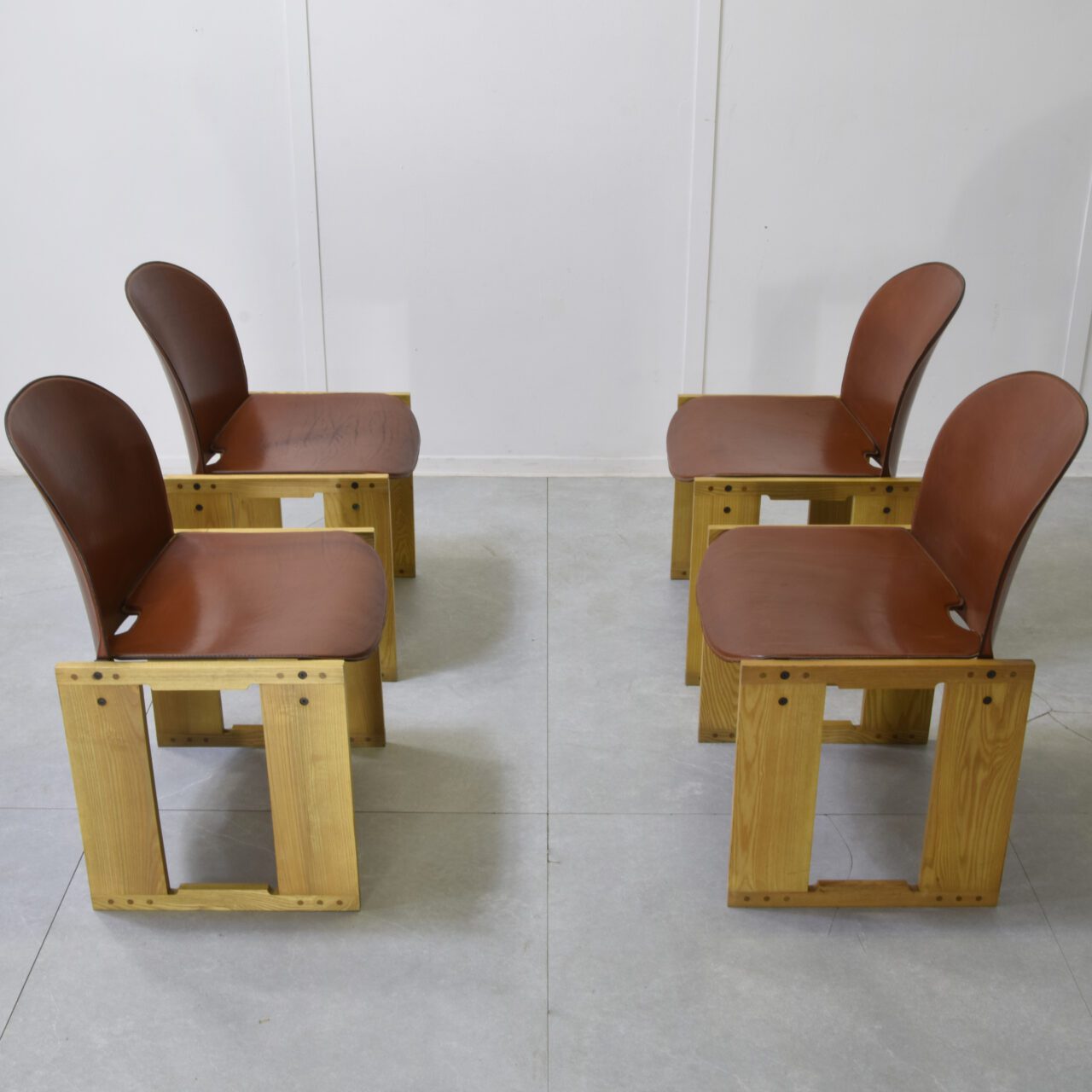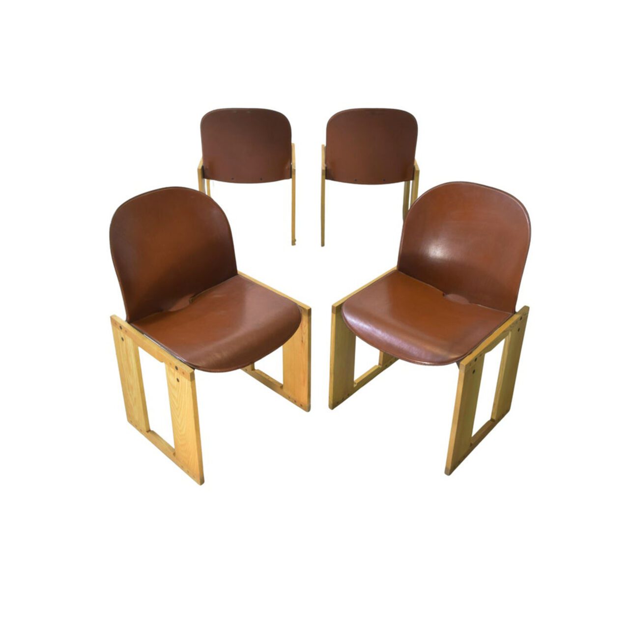 Set di quattro sedie modello Dialogo di Afra e Tobia Scarpa per B&B produzione primi anni 70. La caratteristica più distintiva è la struttura in legno chiaro con una costruzione a cavalletto. L’aspetto cruciale è l’esposizione delle giunzioni e dei dettagli costruttivi, che non vengono nascosti ma diventano elementi estetici e caratterizzanti, quasi con un’estetica Brutalista o industriale. L’imbottitura è costituita da un guscio in fibra di vetro rivestito in pelle di colore marrone cuoio (cognac). La forma è ergonomica, con una curva che accoglie e sostiene la schiena.