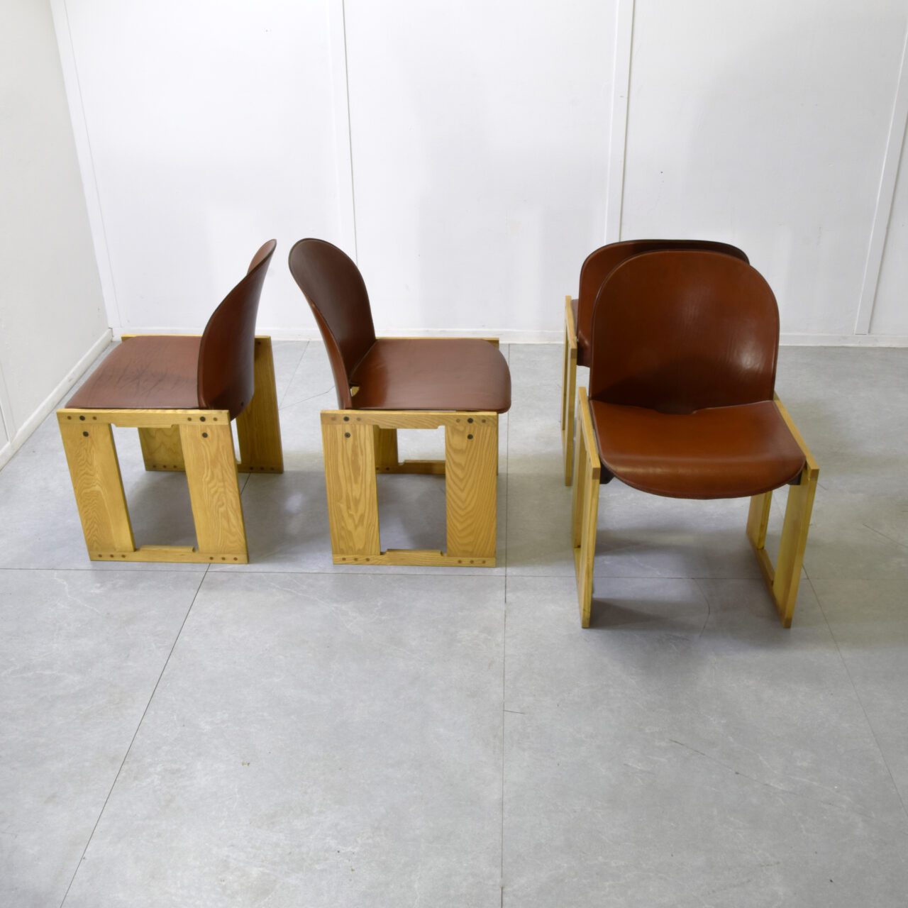 Set of four Dialogo model chairs by Afra and Tobia Scarpa for B&B, produced in the early 70s. The most distinctive feature is the light wood structure with a trestle construction. The crucial aspect is the exposure of the joints and construction details, which are not hidden but become aesthetic and characterizing elements, almost with a Brutalist or industrial aesthetic. The padding consists of a fiberglass shell covered in brown leather (cognac) upholstery. The shape is ergonomic, with a curve that embraces and supports the back.
