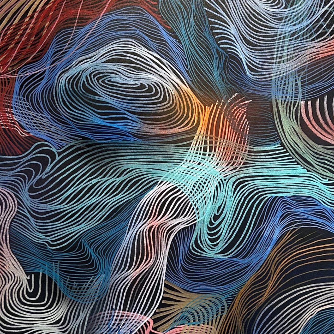 Il personalissimo universo di Awer è la rappresentazione di uno scenario visto non come magma informe, ma come un insieme di reticoli di linee di cui l’artista rivela i meravigliosi meccanismi e in cui si percepisce un’intelligenza creatrice.